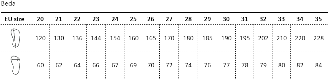 V tabulce uvádíme vždy vnitřní rozměr boty. Tabulku připravujeme na základě vlastního měření nástroji Plus 12 (vnitřní délka) a Clevermess (vnitřní šířka).