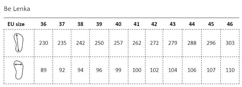 V tabulce uvádíme vždy vnitřní rozměr boty. Tabulku připravujeme na základě vlastního měření nástroji Plus 12 (vnitřní délka) a Clevermess (vnitřní šířka).